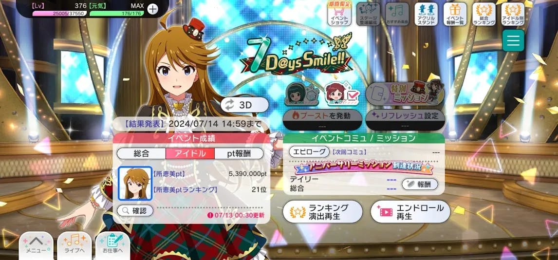 前回5,390,000ptで幕を閉じた7周年イベント「7D@ys Smile!!」でのこと。